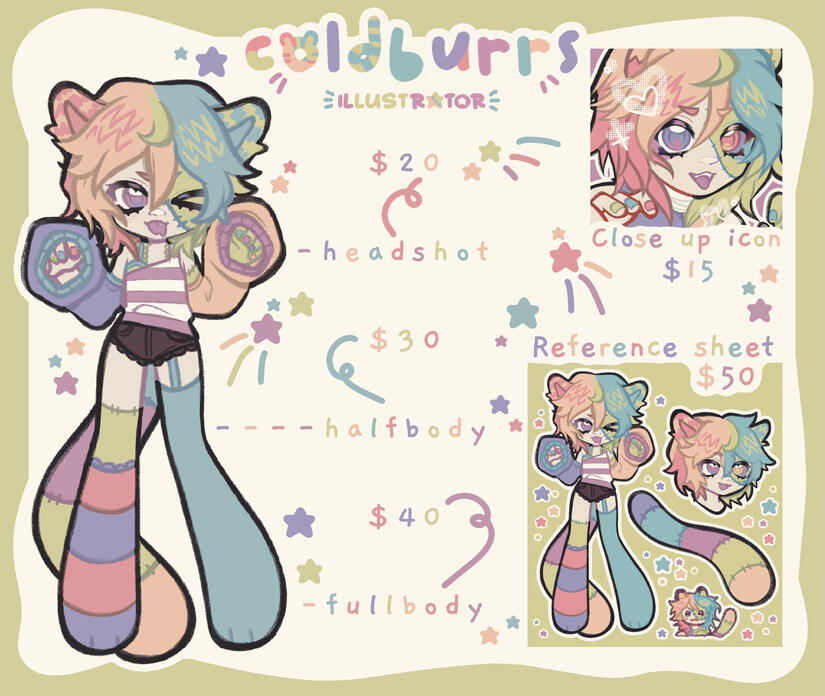 Hi! My name is burrs, my persona is a zombie tiger! I’m a freelance artist that loves to draw in a cute semi-chibi style! I want to make my own vtuber model someday and start streaming! I want to start making physical merch and go to conventions for artist alley!!!